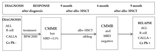 Evolution of disease. CMMR = complete medullary morphological remission; MRD = minimum residual disease; Allo-HSCT = allogeneic hematopoietic stem cell transplantation; Cz Ph = Philadelphia Chromosome.