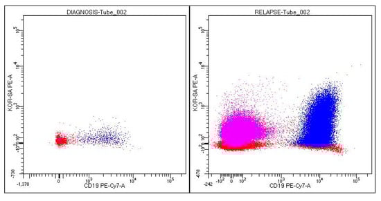 Immunophenotypic expression of KOR-SA at diagnosis versus relapse. In blue: CD19+ blasts (and CD34+). In violet: granulocytes as internal control (almost absent at diagnosis due to the hypocellular marrow sample and consequently few events).