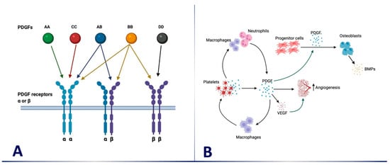 (A) PDGF 4 isoform homodimers and heterodimers binding on PDGF receptors for dimers on a cell surface (α and/or β). PDGF-AA, -BB, and -CC bind to PDGFR α/α, PDGF-AB, -BB, -CC, and -DD bind to PDGFR α/β, while PDGF-BB and DD bind to PDGFR β/β; (B) At injury sites, platelets release α-granules containing PDGFs, which in turn induce chemotaxis and proliferation of a multitude of cells important in healing and bone regeneration. The activation of macrophages and neutrophils results in increased production of PDGF, which results in increased angiogenesis directly or as a result of increased vascular endothelial growth factor (VEGF). PDGF also induces differentiation of osteoblast progenitors to osteoblasts, resulting in increased production of bone morphogenetic proteins (BMPs) by osteoblasts.
