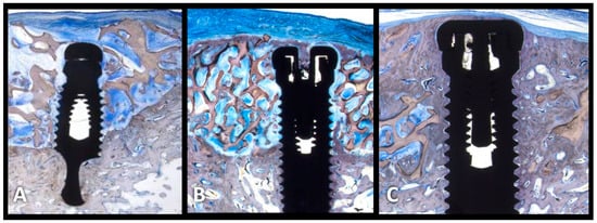 Vertical bone regeneration using rhPDGF + Bone block. (A) GBR using deproteinized bone block and collagen membrane. Bone block embedded in connective tissue and absence of new bone (4 months); (B) GBR using deproteinized bone block and collagen membrane and rhPDGF. New bone is present in the apical and coronal aspects of the implants, but the center is dominated by connective tissue (4 months); (C) GBR using deproteinized bone block with rhPDGF (no membrane). New bone is present throughout the entire length of the implants (4 months).