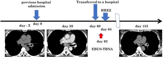 Chest CT scan revealing enlargement of subcarinal lymph nodes, initially undetected. (A) An increase in the size of the lymph nodes when treated as a fever of unknown origin. (B) Shrinkage of lymph nodes after anti-tuberculous treatment. (C) HREZ: isoniazid, rifampicin, ethambutol, pyrazinamide. EBUS-TBNA: endobronchial ultrasound-guided transbronchial needle aspiration.