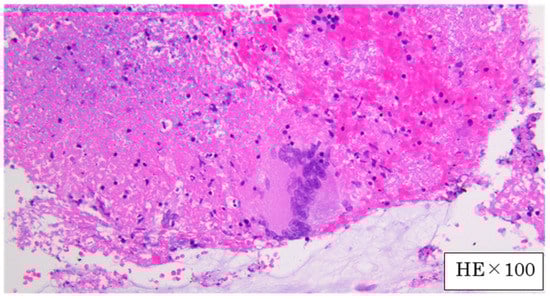 A conference was held with a respiratory surgeon. Because the patient’s condition was deteriorating, the mediastinoscopic lymph node biopsy was abandoned. EBUS-TBNA was performed 2 days after the transfer. Bronchoscopy revealed no abnormal findings without the dull formation of the carina (Figure 3). A needle aspiration biopsy of the subcarinal lymph nodes was performed using EBUS-TBNA. The disease was diagnosed as mediastinal tuberculous lymphadenitis because the PCR test and culture of the obtained specimen were positive for Mycobacterium tuberculosis. Histopathological findings of the lymph nodes showed epithelioid cell granulomas and multinucleated giant cells compatible with tuberculosis (Figure 4). Treatment with daily isoniazid 300 mg/day and daily rifampicin 450 mg/day, plus ethambutol 750 mg/day and pyrazinamide 1.2 g/day on twice-weekly dialysis days, was started immediately. Mycobacterium tuberculosis detected in this patient had good drug sensitivity to anti-tuberculosis drugs. The fever subsided immediately. However, itching appeared during the treatment, which was thought to have been caused by the drugs. We temporarily reduced anti-tuberculosis drugs and treated itching with anti-allergic drugs. After that, the itching improved, and the treatment with anti-tuberculosis drugs was continued. The patient’s weight gradually increased, and her status improved. After that, she was discharged from the hospital. Three months after the initiation of treatment, a CT showed a reduction in the size of the mediastinal lymph nodes (Figure 2C). The treatment was continued for 9 months after initiation, and there was no recurrence after the treatment.