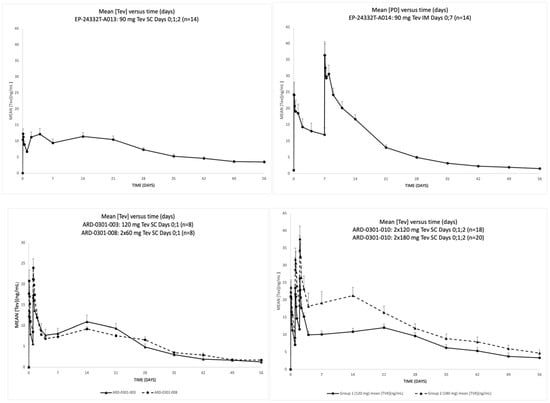 | Administration (dose, route, schedule); n | 90 mg SC; D0, D1, D2 n = 14 | 90 mg IM; D0, D7; n = 14 | 120 mg SC; D0, D1; n = 8 | 120 (2 × 60) mg SC; D0, D1; n = 8 | 120 (2 × 60) mg SC; D0, D1, D2; n = 18 | 180 (2 × 90) mg SC; D0, D1, D2; n = 20 |