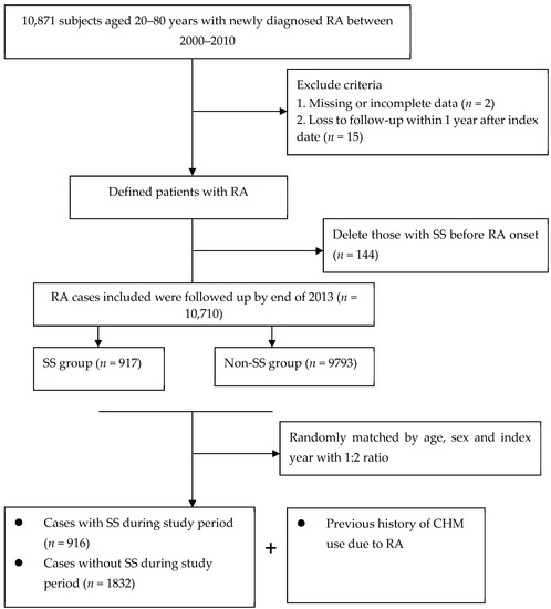 In the present study, the RA cohort was constructed by identifying all people in the linked claims data set who were 20–80 years of age and had at least three outpatient service claims or one hospital service in which RA was recorded (International Classification of Diseases, 9th Revision, Clinical Modification, ICD-9-CM 714.0) between January 2000 and December 2010. Afterwards, all enrollees were connected to the catastrophic illness registry to ensure diagnostic validity. This is because beneficiaries with major diseases, such as autoimmune disorders, are exempted from the required cost under the NHI program. This approach allowed us to strictly define RA cases and reduce potential misclassification bias. We, therefore, used the date of approval for catastrophic illness registration as the starting point for patients diagnosed with RA. We adhered to the rule that subjects must be excluded if they had any history of SS prior to RA onset. All enrollees were followed up from the date of enrollment to the date of incident SS or the end of follow-up visit, whichever happened first. This article research project was approved by Ethics Committee of the Buddhist Dalin Tzu Chi Hospital (No. B10004021-1) and was conducted with consideration of Helsinki Declaration in all phases of the study. Additionally, the institutional review board waved the need for informed consent for this study since an encrypted database was fully used.