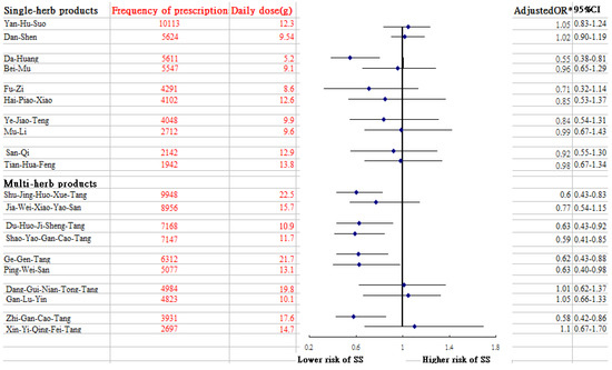 Risk of SS in relation to the 10 most-used single-herb and multi-herb CHM products for RA patients. * Model adjusted for age, residential area, monthly income, medication use and CCI.