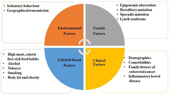 Reports have suggested that CRC occurrence and mortality rates differ according to the geographic variation in locations around the globe, age, gender, and racial groups [5,6]. It was found that there is a significant enhancement in CRC incidence and mortality in countries with high and medium Human development index (HDI) that are more fascinated with the “Western” lifestyle [5,6,7]. In the modern world, economic growth followed by industrialization has led to the adaptation of Western dietary and lifestyle patterns, leading to a rise in the incidence rate of CRC in developed countries [3,7]. According to several reports, India, followed by Poland, in Asia or Europe, has a significantly enhanced CRC incidence rate with medium HDI. Countries such as the United Kingdom, India, Sweden, Germany, Australia, and a few others have a high incidence rate in younger people less than 50 years of age [4,6,7]. According to recent advancements, it is clear that the survival rate of CRC is based on the stage of diagnosis. Patients diagnosed at the early stages have a higher chance of survival than those diagnosed late [4,8]. Although there is an increase in the incidence rate, it does not necessarily translate to enhanced mortality rates in many countries, such as Slovenia and Italy, which might be because of improved CRC screening, leading to the detection of CRC at early stages. At the same time, countries such as Russia and Brazil have increased incidence and mortality rates with minimal medical sources [3,4,8,9]. Therefore, it can be concluded that proper medical and early screening facilities can help in reducing the mortality rates and the severity of the disease in almost all countries around the globe. According to reports, some of the well-recognized risk factors associated with CRC are environmental, dietary, genetic, and clinical factors, which are shown in Figure 1.
