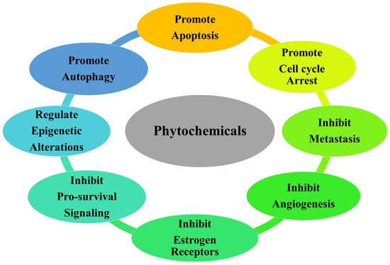 A schematic diagram representing the various functions of phytochemicals involved in the regulation of molecular pathways associated with cancer.