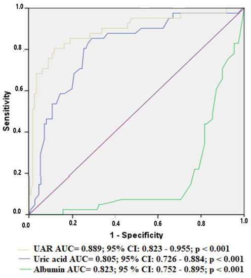 In a ROC curve analysis, UAR exhibited better discriminative performance (AUC: 0.889, p < 0.001) than uric acid (AUC: 0.805, p < 0.001) and albumin (AUC: 0.823; p < 0.001) (Figure 1). In addition, a cut-off value of the UAR in predicting the MACCEs was determined to be greater than 1.68, with a sensitivity of 88% and a specificity of 66%.