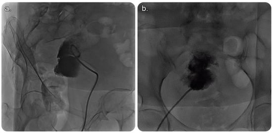 Later on, under fluoroscopic guidance and using the same percutaneous retrograde-fashion access, the obstructed cervix was successfully accessed using a 5-French-size angled catheter and wire combination, followed by dilation using a 10 mm diameter by 4 cm length balloon (MUSTANG, Boston Scientific, Marlborough, MA, USA).