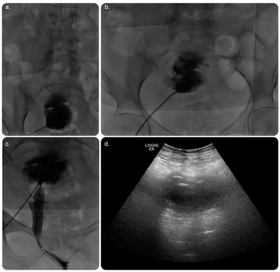 (a) Fluoroscopic image of the pelvis showing a wire being introduced through the same access to be directed into the cervix with a trial to negotiate the obstruction. (b) Fluoroscopic image showing a catheter being used to direct the wire into the cervix. (c) Fluoroscopic image after successfully crossing the cervical stenosis/occlusion with free passage of contrast through the vagina. The wire can be seen projecting through the vagina to outside the body. A stretching balloon was used to dilate the stenosed/obstructed area of the cervix to prevent possible future recurrence of the stenosis. (d) Grey-scale ultrasound image performed on day 1 postoperatively, showing significant improvement in the collection with minimal residual amount of the collection.