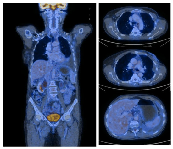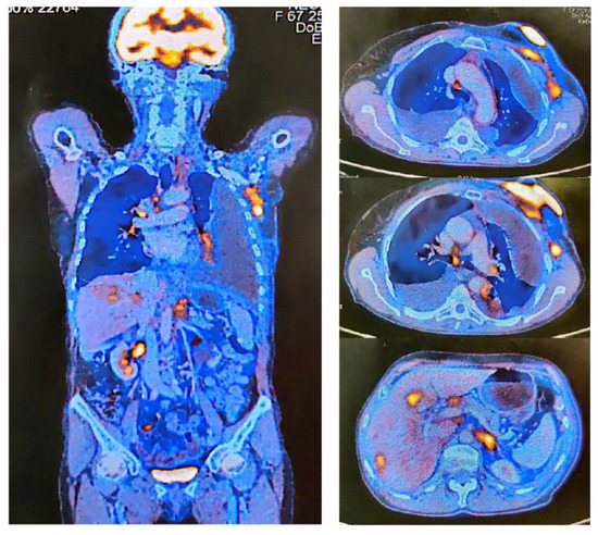 At the end of the chemotherapy treatment, in June 2021, the patient underwent a second PET-CT (Figure 3) to assess the disease response. The exam revealed significant left breast dimensional regression with skin retraction and diffusely and slightly increased metabolic activity and small residual axillary lymph nodes with mild metabolic activity. In addition, multiple bone lesions of a maximum of nine mm at the level of the left iliac wing without metabolic activity (probably post-therapeutic inactivated metastases) were revealed. The exam concluded that no metabolically active PET-CT lesions were found.