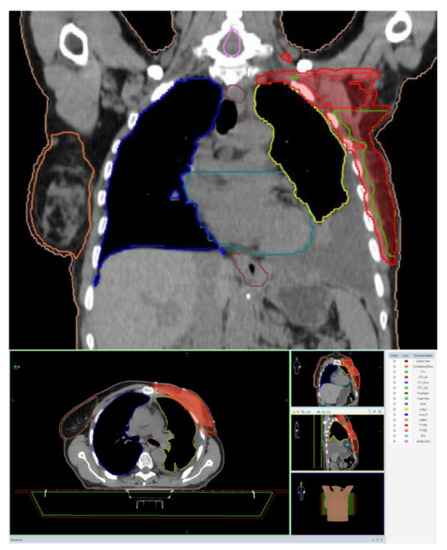 During July–August 2021, the patient underwent adjuvant external radiotherapy at the level of target volumes (PTV50: left breast and locoregional lymph nodes with a total dose of 50 Gy/25 fx at 2 Gy, 5 days/week and at the tumor level with a total dose of 60 Gy/30 fx at 2 Gy, 5 days/week) using the IMRT-VMAT technique (Figure 4).