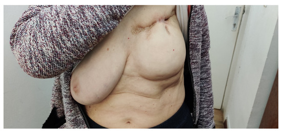 After the experience of the unusual switch from one CDK4/6 inhibitor to another and the patient’s three types of adverse reactions (liver toxicity from ribociclib and hematological and digestive toxicity from abemaciclib), at the time of writing, we are monitoring her closely to best manage the course of treatment. A significantly improved condition of the left breast (after chemotherapy, radiotherapy, and targeted therapy) can be seen now (Figure 6). Moreover, the CBC, as well as the liver enzymes and biomarkers, are within normal limits.