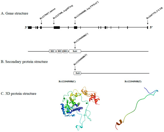 (A) The four XPC complex subunit, DNA damage recognition and repair factor (XPC) variants (rs121965088, rs2227998, rs2279017 and rs2607775) of our patient located on the XPC gene. (B) The normal XPC protein is constructed by the consecutive translation of Rad4, BH1, BH2, and BH3 protein units. However, rs121965088 (*) generates a stop codon and results in premature termination during the Rad4 translation. (C) Consequently, a defective and misfolded XPC protein is produced. The resultant protein architecture is displayed by the protein 3D modeling program SWISS-MODEL.