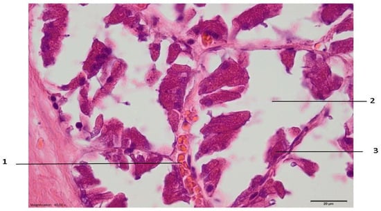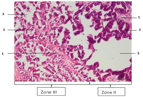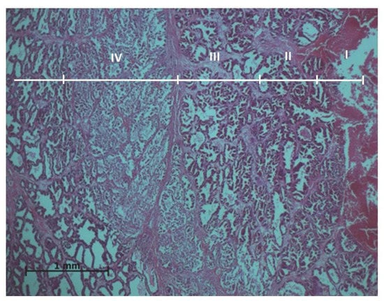 Zone IV is a transitional zone. Lower eosinophilia of the cytoplasm is observed, with less pronounced pyknosis of the nuclei than in the preceding areas. Stromal edema and degeneration of non-striated muscles are also observed. This damage zone extends beyond the lobe, includes the interlobular tissue, and penetrates the adjacent lobes (Figure 4).