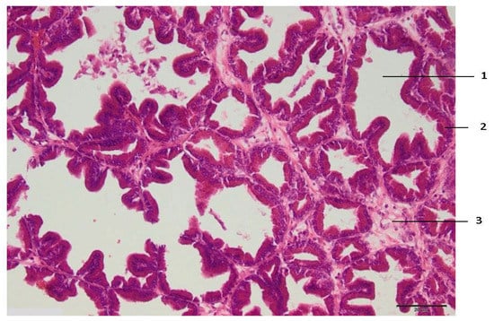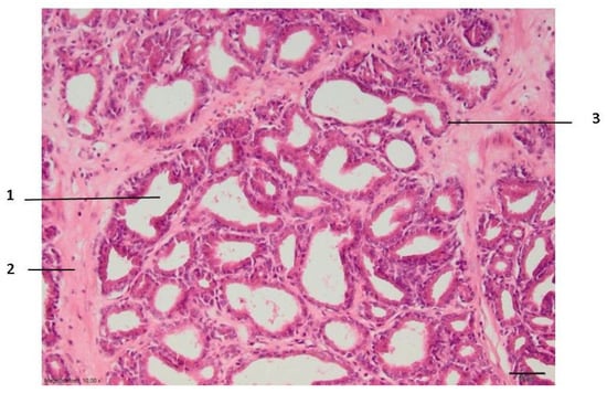 Intact zone of the prostate. Normal tissue structure: 1—glandular epithelium; 2—stroma; 3—prostate alveolus. Microtome-cut sections of prostate samples were stained with hematoxylin and eosin.