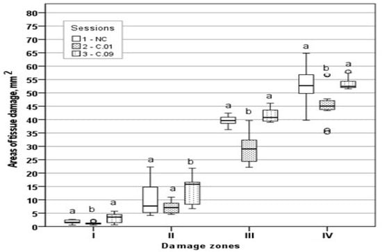 Thus, it was found that the smallest average lesion areas were in experimental session C.01. The lesions in experimental sessions C.09 and NC were of similar size, and in all zones, were significantly larger than the damage areas produced during experimental session C.01 (see Table 1).