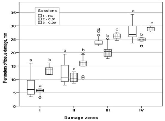 Graphical comparison of tissue damage perimeter distributions by zones. a, b, c—the distributions differed statistically significantly as found by a non-parametric Kruskal–Wallis test.