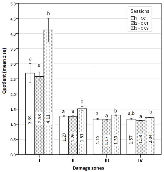 Graphical comparison of damage zone quotients. a, b—the means differed statistically significantly as found by Bonferroni test.