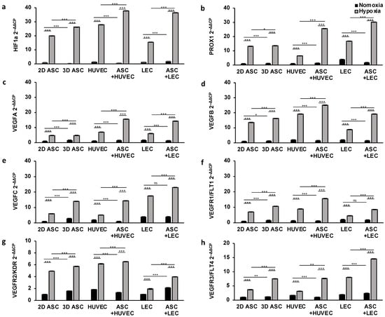 Human dermal lymphatic endothelial cells (LEC) isolated from juvenile foreskin were purchased from PromoCell in passage 2. Cells were cultured in endothelial cell growth medium MV (ECGM MV, PromoCell, Heidelberg, Germany) supplied with a supplement mix (PromoCell, Heidelberg, Germany), 1% amphotericin B (Biochrom GmbH, Berlin, Germany) and 1% penicillin–streptomycin (Biochrom GmbH, Berlin, Germany). Human umbilical vein endothelial cells (HUVEC) were purchased from PromoCell in passage 2. Cells were cultured in endothelial cell growth medium MV (ECGM MV, PromoCell, Heidelberg, Germany) supplied with a supplement mix (PromoCell, Heidelberg, Germany), 1% amphotericin B (Biochrom GmbH, Berlin, Germany) and 1% penicillin–streptomycin (Biochrom GmbH, Berlin, Germany). Co-cultures of ASCs with LECs or HUVECs were grown in endothelial cell growth medium MV (ECGM MV, PromoCell, Heidelberg, Germany). All cell types were incubated at 37 °C, 5% CO2 in a standard cell culture incubator (Thermo Fisher Scientific, Waltham, MA, USA). The medium was changed every 2–3 days. Cells were incubated in <1% O2 and 5% CO2 for experiments under hypoxic conditions at 37 °C. To ensure constant hypoxia, the oxygen concentration was measured in Oxodishes (OD24, OD-1842-01, PreSens GmbH, Regensburg, Germany) every 10 min using the SensorDish® Reader system (PreSens GmbH, Regensburg, Germany) according to the manufacturer’s instructions. This system uses a fluorometric oxygen sensor to monitor the percentage of dissolved oxygen content (% pO2) in the culture medium. Cell number was determined using Countess 2 FL (Invitrogen, Carlsbad, CA, USA). All experiments were performed in triplicate with LECs and HUVECs of the same batch in passages 3–5 and ASCs of the same donor in passage 2.
