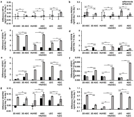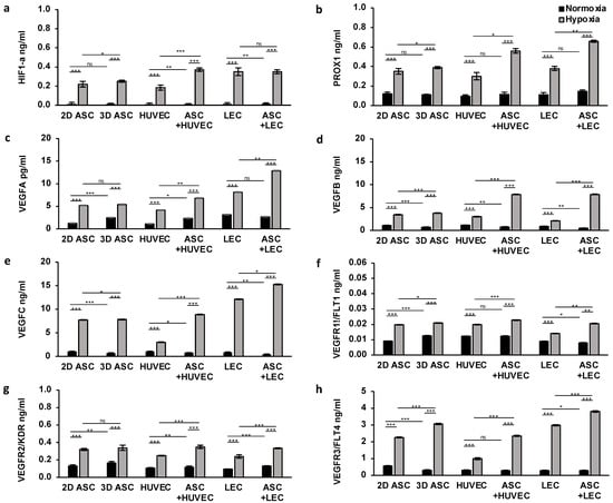 Hypoxia and ASC co-cultures enhance protein levels of endothelial and lymph endothelial cells in scaffolds: the protein level of endothelial and lymph endothelial cells measured by ELISA showed a higher protein synthesis in HUVECs, LECs, and ASCs treated with hypoxia compared with normoxic conditions. Angiogenic protein expression was significantly improved in HUVECs and LECs by the presence of ASCs under hypoxia. The following proteins of endothelial and lymph endothelial cells were analyzed: (a) hypoxia-inducible factor 1 alpha; (b) prospero homeobox 1; (c) vascular endothelial growth factor A; (d) vascular endothelial growth factor B; (e) vascular endothelial growth factor C; (f) vascular endothelial growth factor receptor 1; (g) vascular endothelial growth factor receptor 2; and (h) vascular endothelial growth factor receptor 3. All experiments were repeated at least three times (ns = not significant; * p < 0.05; ** p ≤ 0.01; *** p < 0.001).