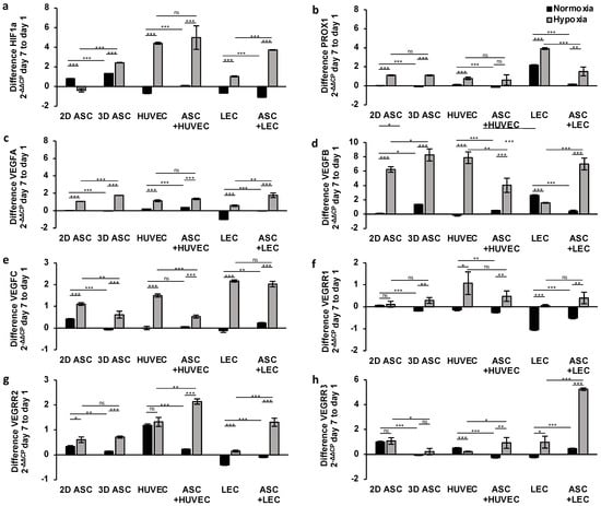 Having demonstrated the effect of hypoxic cultivation after 24 h, we evaluated the potential of a long-term hypoxic treatment over seven days. Therefore, we incubated seeded scaffolds as described previously for seven days under normoxic or hypoxic conditions and assessed the difference in the endothelial and lymph endothelial gene expression, compared with day one. First, we investigated the difference in gene expression of HIF1a (Figure 4a). As a sensitive marker for hypoxia, HIF1a showed a substantial increase in gene expression over seven days in the absence of oxygen regarding all cell types. We evaluated a generalized downregulation of HIF1a under normoxic conditions in endothelial and lymphatic endothelial cells. Further, a two-fold increased HIF1a gene expression level could be found in co-culture with LECs, compared with monoculture, suggesting a markedly long-term supporting effect of ASCs (Figure 4a).