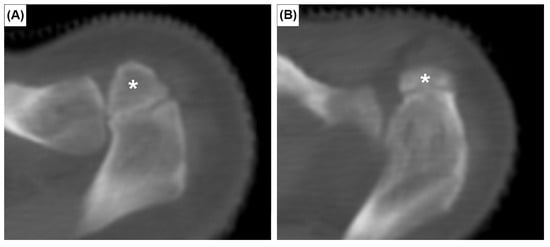 Axial CT images showing two types of os acromiale: meso-acromion (A) and pre-acromion (B). Asterisks indicate the os acromiale.
