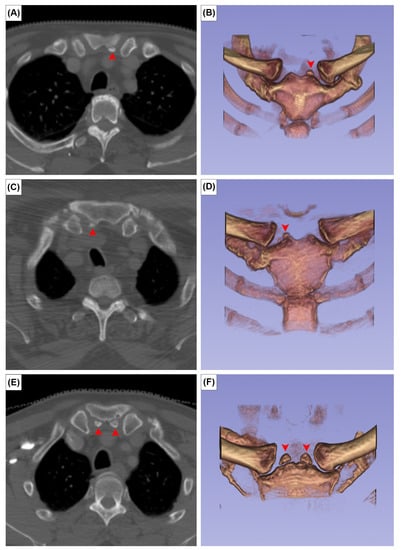 Axial CT images (A,C,E) and 3D reconstruction in anterior view of (B,D,F) the episternal ossicles, left-sided (A,B), right-sided (C,D), and bilateral (E,F) types. Red arrowheads indicate the episternal ossicles.