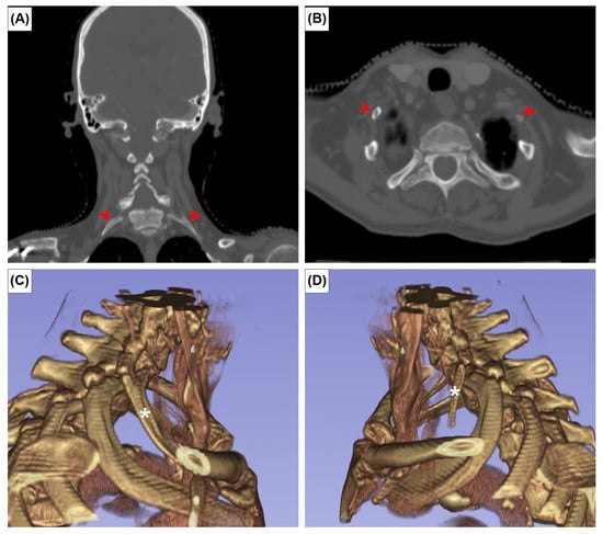 Coronal (A), axial CT images (B) and three-dimensional reconstruction of right (C) and left (D) cervical ribs. Red arrowheads and asterisks indicate the cervical ribs.