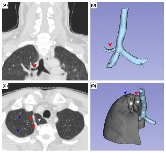 Coronal (A,C) CT images and three-dimensional images of the tracheal bronchus (A,B) and azygos lobe (C,D). Red arrowheads and asterisks indicate the azygos fissure and azygos vein, respectively. Blue arrowheads and # indicate a variant placement of the oblique fissure and unusually small superior lobe of the right lung.