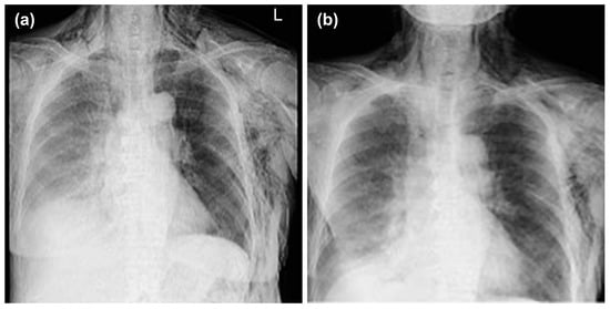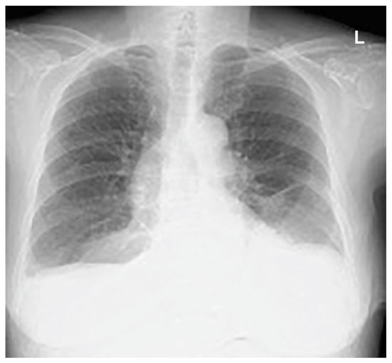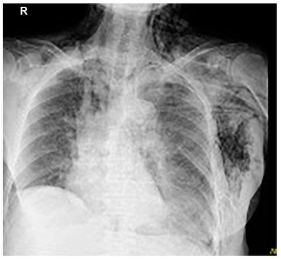 The concept of pneumothorax ex vacuo has also been proposed to describe pneumothorax that occurs after drainage of malignant pleural effusion []. The mechanism of occurrence is not clear, but it is believed to result from the formation of a fibrous pleura due to the infiltration of malignant cells, which limits lung re-expansion. This results in negative pleural pressure and the suction of tissue air into the pleural space, in a phenomenon similar to acute lobar collapse. Much controversy exists regarding the treatment of pneumothorax ex vacuo. However, when the cause is malignant pleural effusion, the prognosis is often poor; thus, conservative therapy rather than active surgical intervention is often performed [].