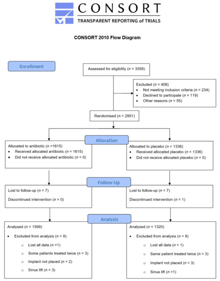 - Durand, R.; Kersheh, I.; Marcotte, S.; Boudrias, P.; Schmittbuhl, M.; Cresson, T.; Rei, N.; Rompré, P.H.; Voyer, R. Do postoperative antibiotics influence one-year peri-implant crestal bone remodelling and morbidity? A double-blinded randomized clinical trial. Clin. Oral Implant. Res. 2021, 32, 1318–1327. [Google Scholar] [CrossRef]