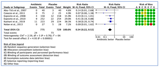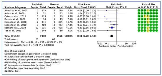| Canullo et al., 2020 [43] | This study found a statistically significant benefit of antibiotics in the reduction of early implant failure at both the implant level and patient level (RR = 0.32 [0.20, 0.51], p < 0.001 and RR = 0.31 [0.20, 0.49], p < 0.001, respectively). The reported finding was based on the fixed effect model. It revealed low risk of bias for only three of the studies included. The current meta-analysis found that the majority of studies included had a low risk of bias, except one (moderate). NNT was not analysed by Canullo et al. (2020). A strength of the current metanalysis is the inclusion of a recently published study and calculation of the NNT. |