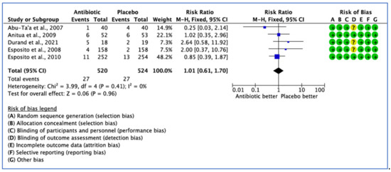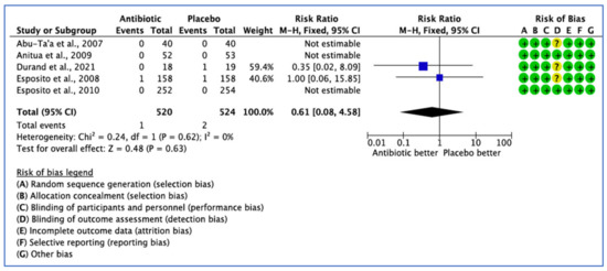 | Jain, Rai, Singh and Taneja, 2020 [44] | The metanalysis implemented by Jain et al. (2020) included five RCTs rated as having a low risk of bias assessing the use of preoperative amoxicillin 1 h prior to surgery with a total of 1032 patients (514 in antibiotic and 518 in placebo groups) and 1919 implants (952 in the antibiotic group and 967 in the placebo group) for the prevention of both the number of implant failures and the number of patients with implant failures after a minimum of 3 months, from implant placement in healthy individuals, and concluded that the number of implants failed was statistically fewer in the antibiotic group, p = 0.006, with 0% heterogeneity. The number of patients that suffered from implant failure was significantly lower in the antibiotic group, p = 0.006 with 0% heterogeneity. This study is consistent with the current finding; however, our study included a larger number of randomised controlled trials including any antibiotic regardless of the timing of administration and revealed statistically significant results. |