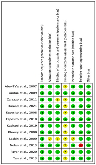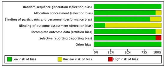 - Higgins, J.; Savović, J.; Page, M.J.; Elbers, R.G.; Sterne, J.A.C. Chapter 8: Assessing risk of bias in a randomized trial. In Cochrane Handbook for Systematic Reviews of Interventions; Version 6.3; Higgins, J., Thomas, J., Chandler, J., Cumpston, M., Li, T., Page, M.M., Welch, V., Eds.; John Wiley and Sons: Chichester, UK, 2022. [Google Scholar]