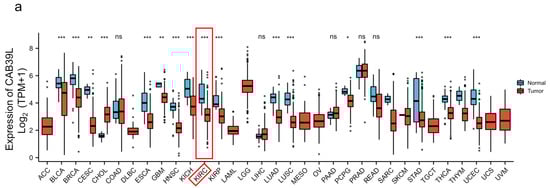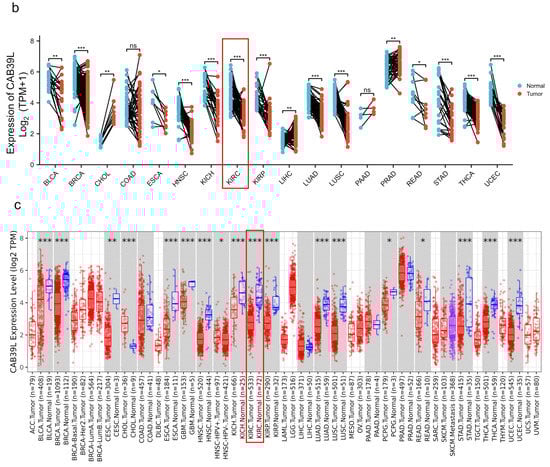 The mRNA levels of CAB39L were determined in 33 types of cancer from independent databases. Firstly, the mRNA expression of CAB39L in TCGA database was investigated. CAB39L expression was markedly lower in tumor samples than normal kidney tissues, especially in kidney renal papillary cell carcinoma (KIRP), KIRC, and kidney chromophobe (KICH) (Figure 1a,b). The same expression trend was also observed in the TIMER database (Figure 1c). The above findings indicated that CAB39L may have a suppressive tumor-growth effect in most cancers.