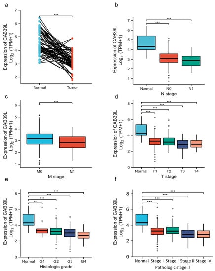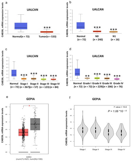 GEPIA (http://gepia.cancer-pku.cn/, accessed on 3 March 2021) [] is a comprehensive website that analyzes and visualizes the RNA data of different tumors and normal samples. On this basis, the mRNA expression of CAB39L was compared between KIRC and normal samples in this study. The mRNA expression of CAB39L at different pathologic stages was also evaluated.