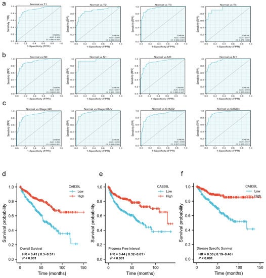The diagnostic value of CAB39L mRNA expression for various clinical characteristics of KIRC patients was evaluated using ROC curves. The AUC value was 0.9 for T1 stage, 0.889 for T2 stage, 0.959 for T3 stage, 0.949 for T4 stage, 0.921 for N0 stage, 0.957 for N1 stage, 0.916 for M0 stage, 0.955 for M1 stage, 0.894 for I and II stage, 0.958 for III and IV stage, 0.895 for G1 and G2 stage, and 0.947 for G3 and G4 stage (Figure 4a–c). The upper results showed that the transcriptional level of CAB39L was relatively specific and sensitive for KIRC diagnosis.