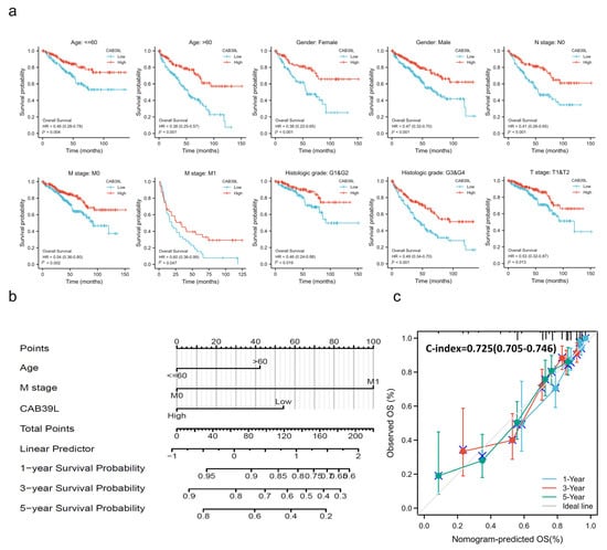Kaplan–Meier curves were used to verify the prediction of CAB39L mRNA level for clinical outcomes. As shown in Figure 4d–f, OS (HR = 0.41, p < 0.001), PFS (HR = 0.44, p < 0.001), and DSS (HR = 0.30, p < 0.001) for KIRC patients with relatively low CAB39L expression were all significantly worse than those with high CAB39L expression. The effect of CAB39L expression on OS in KIRC patients with various stages and clinical parameters was also evaluated (Figure 5a). Univariate and multivariate Cox regression analyses were further applied to explore the independent prognostic value of CAB39L (Table 3). The results showed that the lower mRNA expression of CAB39L was independently related to a significantly shorter OS (HR = 0.6, 95% CI: 0.375–0.962, p = 0.034). On this basis, the OS of KIRC patients at 1, 3, and 5 years was predicted using the nomogram model (Figure 5b), and the efficiency of the nomogram for OS was validated by calibration curves (Figure 5c). The nomogram included age, M stage, and CAB39L, with a C-index of 0.725. The above results demonstrated that the transcriptional level of CAB39L had a strong prognostic value.