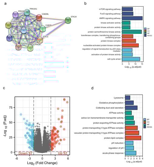STRING (https://string-db.org/, accessed on 4 March 2021) [] was applied to establish a protein–protein interaction (PPI) network of CAB39L. The prediction pathways of CAB39L and its associated proteins were also analyzed by GO and KEGG.