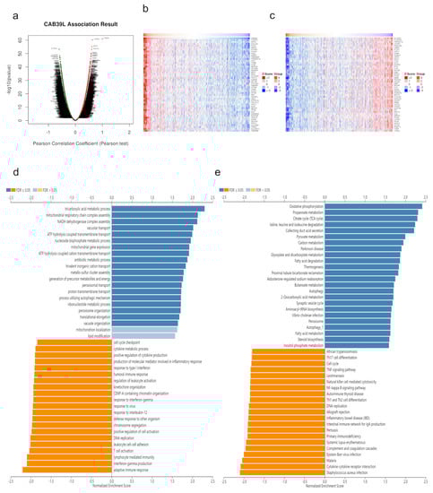 CAB39L co-expressed genes and functional enrichment analysis (LinkedOmics). (a) Volcano map of CAB39L co-expressed genes in KIRC. (b) Fifty genes positively associated with CAB39L. (c) Fifty genes negatively associated with CAB39L. (d) GO enrichment analysis of CAB39L co-expressed genes. (e) KEGG enrichment analysis of CAB39L co-expressed genes.