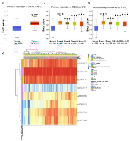 Analysis of methylation level in the CAB39L gene promoter region. (a) Analysis of methylation level of the CAB39L gene promoter region for KIRC compared with normal tissues (UALCAN). (b,c) Analysis of the relationship between methylation level of the CAB39L promoter region and pathologic stages (UALCAN). (c) Analysis of the relationship between methylation level of the CAB39L promoter region and histologic grades (UALCAN). (d) Analysis of methylation level of the CAB39L promoter region at CpG sites (MethSurv). *** p < 0.001.