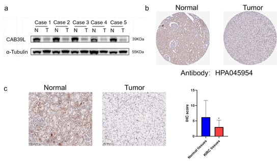 The protein level of CAB39L in paired KIRC samples. (a) Western blot detection of CAB39L expression in five paired KIRC samples. (b) IHC staining outcomes of CAB39L in KIRC and adjacent non-tumor tissues (HPA). (c) IHC staining outcomes of CAB39L in KIRC and adjacent non-tumor tissues (clinical paired KIRC tissues). * p < 0.05.