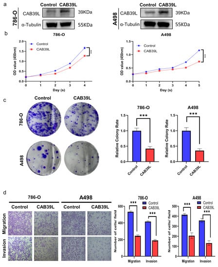 The expression of CAB39L was overexpressed using plasmid to explore the impact of CAB39L on the proliferation of KIRC cells. The overexpression of CAB39L significantly impaired the proliferative capability of A498 and 786-O cells, which was confirmed by CCK-8 and colony formation assays (Figure 10a–c). Furthermore, transwell migration and invasion assays revealed that CAB39L restrained the metastatic capacity of A498 and 786-O cells (Figure 10d). In conclusion, the above results suggested that CAB39L impaired the tumorigenesis of KIRC.