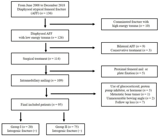 The following patients were excluded: (1) presence of comminuted fracture with high-energy trauma (n = 10); (2) bilateral AFFs (n = 9); (3) conservative treatment (n = 3); (4) internal fixation using proximal femoral nail antirotation or plate (n = 5); (5) use of glucocorticoid, proton pump inhibitor, or hormone (n = 3); (6) presence of metastatic bone tumor (n = 1); (7) unmeasurable bowing angle at the opposite intact femur (n = 2); and (8) no follow-up for more than 2 years after surgery (n = 7). Finally, 95 patients were included in the study. The patients were divided into two groups: Group I (with iatrogenic fracture; n = 20) and Group II (without iatrogenic fracture; n = 75) (Figure 2).