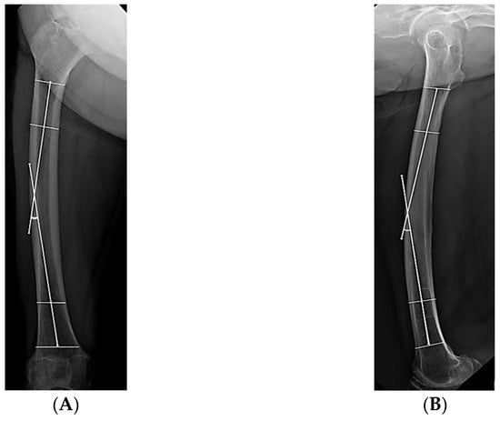 Measurement of femoral bowing in the opposite intact femur. (A) Lateral bowing on an anteroposterior X-ray. (B) Anterior bowing on a lateral X-ray.