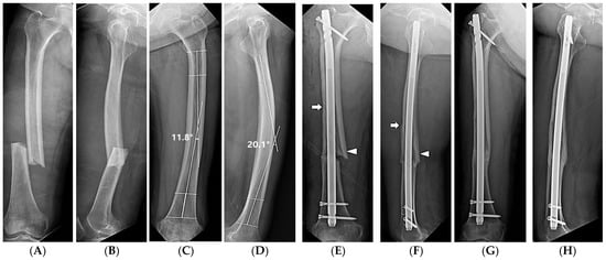 The fracture characteristics are shown in Table 3. The mean femoral BMD in Group I (−2.9; range: −4.3 to −0.8) was significantly lower than that in Group II (−2.5; range: −4.5 to −0.3; p = 0.046). The mean lateral bowing angle in Group I (14.7° ± 5.9°; range: 2.4–24.8°) was significantly higher than that in Group II (7.9° ± 6.5°; range: 0.2–21.9°; p < 0.001). The mean anterior bowing angle in Group I (16.6° ± 4.2°; range: 9.7–25.1°) was also significantly higher than that in Group II (13.0° ± 7.8°; range: 1.0–29.5°; p = 0.008). However, no significant differences were observed in spinal BMD, diaphyseal AFF location, nail entry point, nail diameter, nail length, medullary cavity diameter and the difference (ΔD) in mm between the inner canal and IM nail diameter between the two groups. Nonunion occurred in 1 of 20 patients (5.0%) in Group I, and 5 patients (6.7%) in Group II (p = 1.000). All iatrogenic fracture sites were completely healed (Figure 5). The time to full weight bearing after surgery in Group I (24.4 ± 1.3 days; range: 20–28) was significantly longer than that in Group II (1.6 ± 0.3 day; range: 1–5; p < 0.001).
