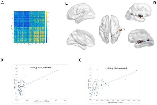 (A)The CPT-II VAR score was significantly associated with the beta-band (13–32.5 Hz) LPS between right hemispheric fusiform gyrus (FG) and lingual gyrus (LG). eLORETA and BrainNet Viewer were used to create the figure. (B) The matrix of the correlation coefficients for the value of beta-band lagged phase synchronization (LPS) of all pairs from 84 regions of interest. (C) Patients with higher CPT-II VAR scores had greater beta-band EEG functional connectivity between right hemispheric FG and LG. The linear regression line was shown to model a linear trend seen in the scatterplot.