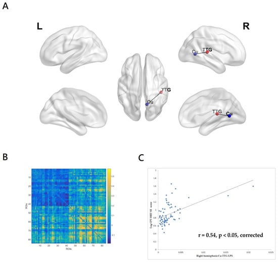 (A)The CPT-II HRTSE score was significantly associated with the gamma-band (33–45 Hz) LPS between right hemispheric cuneus (Cu) and transverse temporal gyrus (TTG). eLORETA and BrainNet Viewer were used to create the figure. (B) The matrix of the correlation coefficients for the value of gamma-band lagged phase synchronization (LPS) of all pairs from 84 regions of interest. (C) The patients with higher CPT-II HRTSE scores had greater gamma-band EEG functional connectivity between right hemispheric Cu and TTG. The linear regression line was shown to model a linear trend seen in the scatterplot.