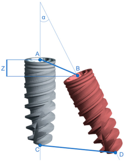 The parameters used in this study to assess the accuracy of implant insertion were the following: total coronal deviation (indicated as distance AB; distance between the coronal center of the planned and the placed implant), total apical deviation (distance CD; distance between the apical center of the planned and placed implant), deviation in depth on the Z axis (distance between the coronal center of the planned implant and a straight line orthogonal to the longitudinal axis of the implant, intersecting the coronal center of the placed implant) (Figure 4), angular deviation calculated both on the bucco-lingual plane (angle made by the axes of the planned and placed implants, measured on the plane transverse to the arch curvature) and mesio-distal plane (angle made by the axes of the planned and placed implants, measured on the plane tangent to the arch curvature), and the area of imprecision (Figure 5).